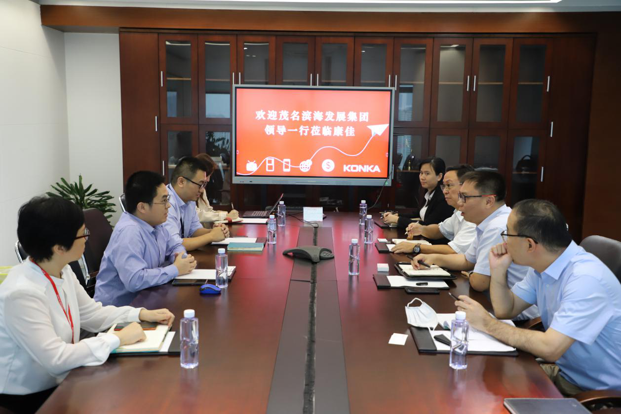在康佳集團股份有限公司,戰略發展中心總經理常賀瑞對黃遠維等一行的來訪表示歡迎,他表示,茂名濱海新區地理位置獨特,港口建設優越,發展空間廣闊。他希望未來康佳集團能跟茂名濱海發展集團深化溝通對接,探尋合作。黃遠維表示康佳集團科技園區、產業產品、平臺服務、投資金融四大業務群體優勢突出,他希望雙方能在康養小鎮、科技載體等領域加強合作。