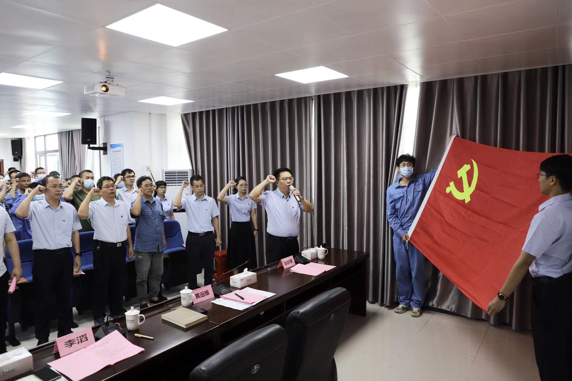 上午10點30分,全體起立,大會在莊嚴的國歌聲中拉開序幕。隨后,黃遠維帶領(lǐng)參會全體黨員一起重溫入黨誓詞。
